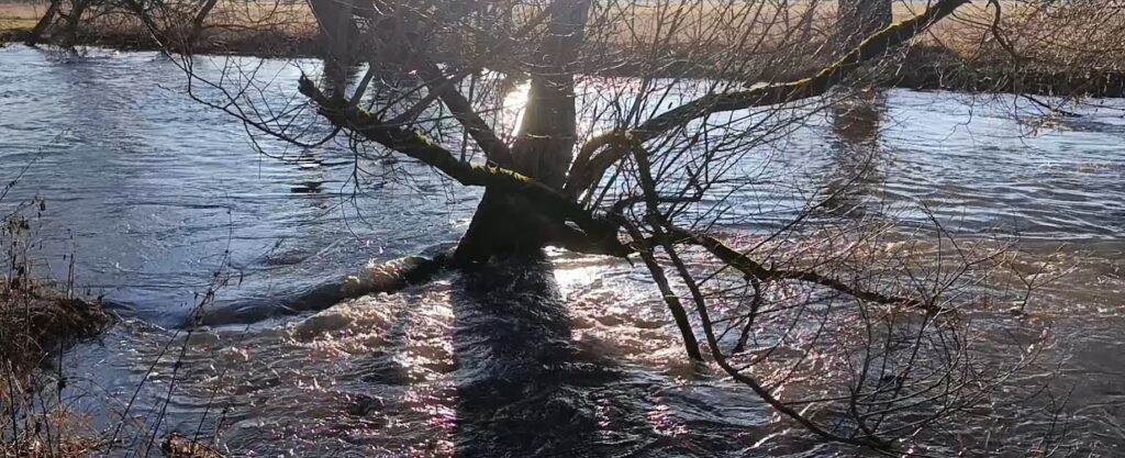 Eine Andacht über das, was uns fest stehen lässt Heute am Fluss. Das Wasser steigt, ein Baum steht mittendrin. Die