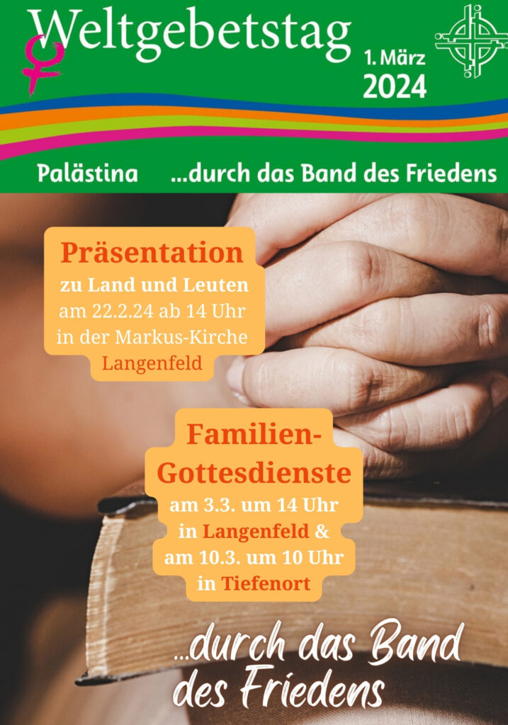 Am 3. März um 14 Uhr in der Markuskirche Langenfeld und am 10. März um 10 Uhr im Evangelischen Gemeindehaus Tiefenort finden zwei Familiengottesdienste zum Weltgebetstag statt. „Die Liturgie unter dem Motto ‚…durch das Band des Friedens‘ wurde von palästinensischen Christinnen erarbeitet und gibt uns Einblicke in das Leben und den Glauben der Menschen dort“, erzählt Pfr. Volkmann. Aktuell bereiten Kinder und Erwachsene aus beiden Orten diese Gottesdienste vor und machen den Weltgebetstag so auch für uns anders erlebbar.